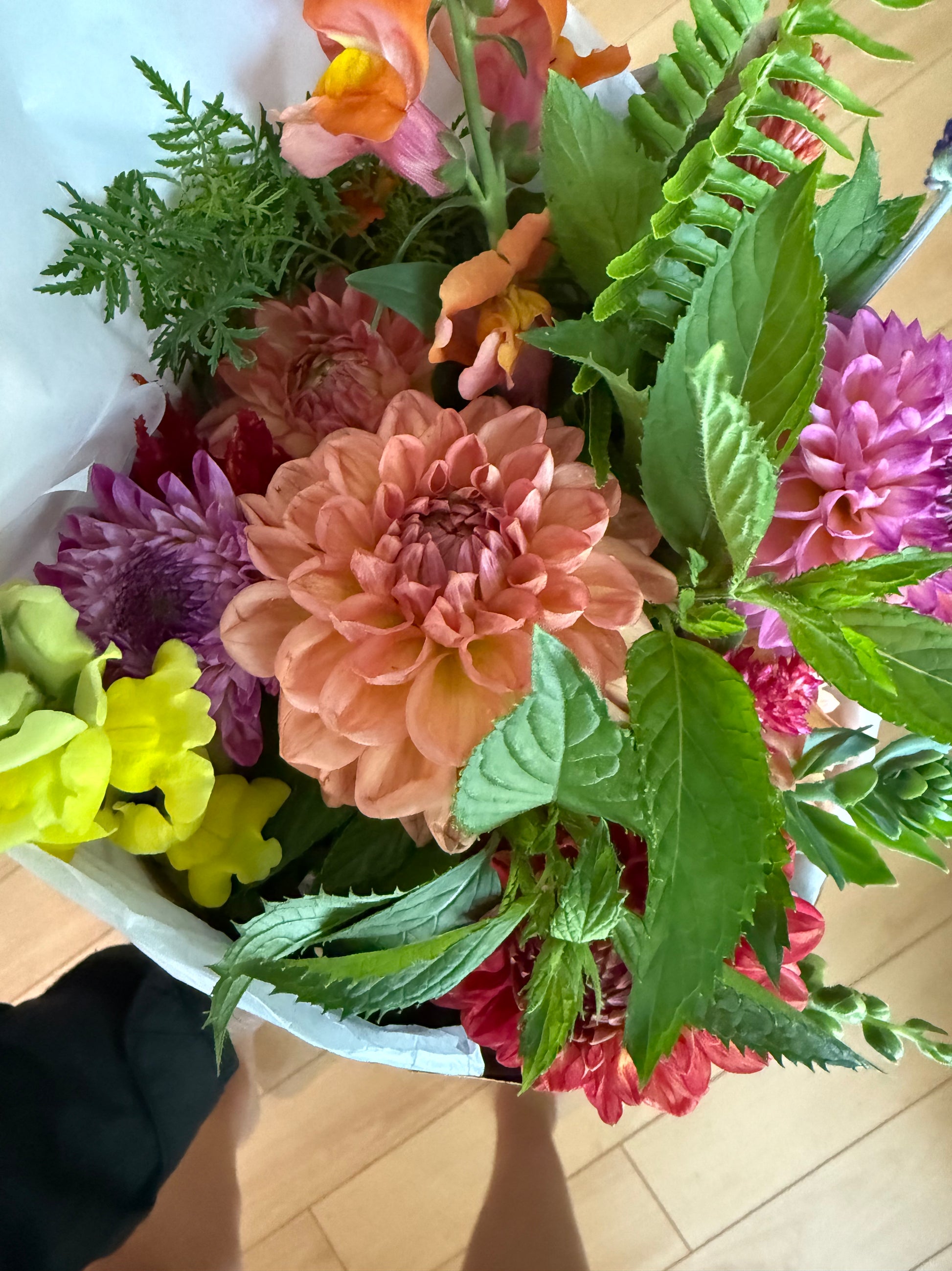 Crafted from whatever is blooming that week — think snapdragons, dahlias, zinnias, herbs like lavender and mint, or even surprise touches like strawberry blossoms — these bouquets bring the beauty of the season right to your hands.